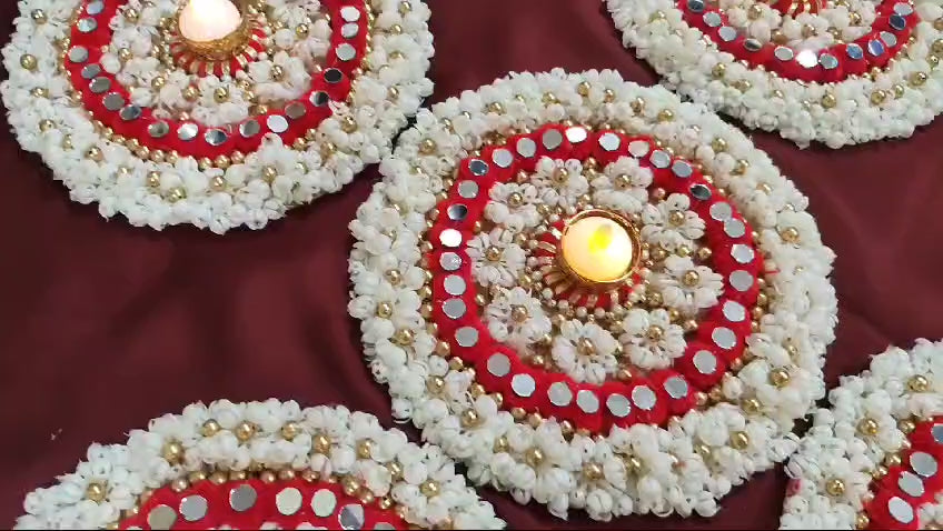 Enhance your home’s festive appeal with this stunning Artificial Flower Rangoli Mat with Tea Light Holder. Its intricate floral design, highlighted with red accents and golden embellishments, makes it a unique and eye-catching décor piece. This handcrafted mat is designed to mimic the beauty of traditional rangoli without the mess of powders.